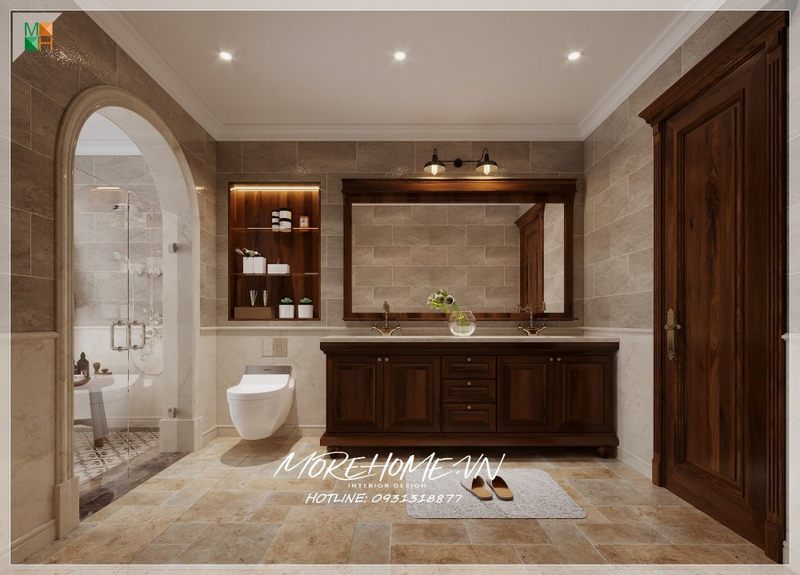 Phòng tắm trang trí có bồn tắm phong cách indochine không gian nội thất tông màu sáng mang đến vẻ sang trọng, sự thoải mái dễ chịu cho gia chủ khi sử dụng