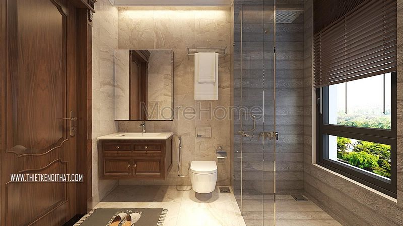 Tủ lavabo treo tường mặt đá trắng gỗ óc chó với ngăn kéo để đựng các vật dụng nhỏ nhắn trong phòng tắm khá tiện lợi.