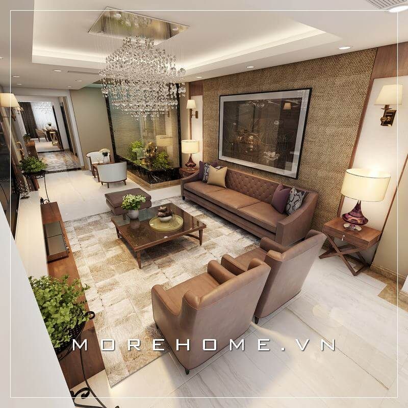 Sofa phòng khách được thiết kế bằng gỗ óc chó kết hợp với bọc nỉ màu nâu sang trọng để tạo nên một phong cách biệt thự tân cổ điển.
