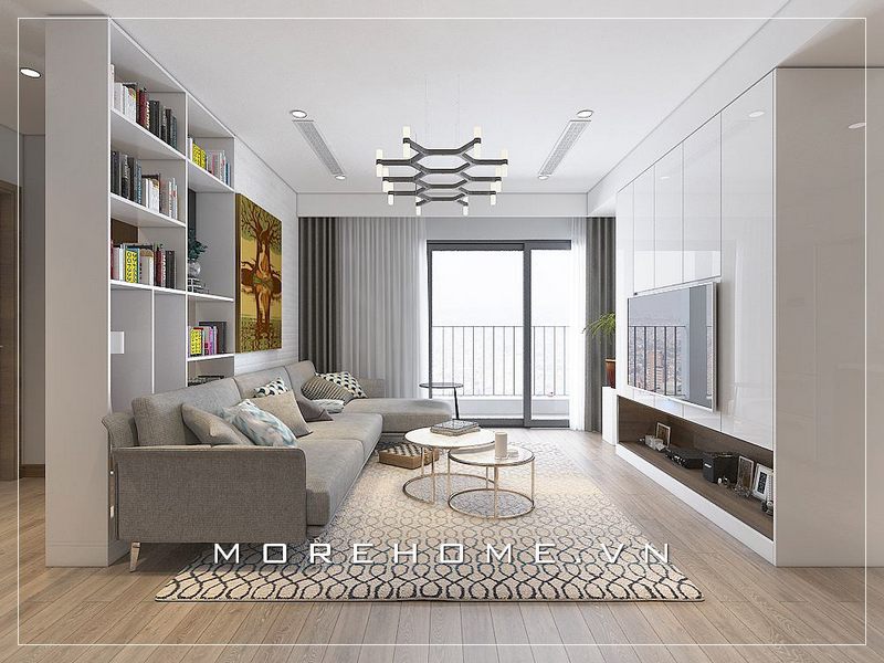 Không gian phòng khách căn hộ chung cư hiện đại được tối ưu hóa bởi thiết kế sofa góc tinh tế với sắc xám êm ái của vải bọc đầy thu hút.