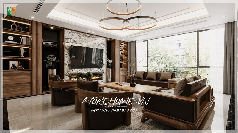 Phòng khách biệt thự, nhà phố hiện đại và trẻ trung với bộ sofa văng da làm tâm điểm, nội thất gỗ óc chó cao cấp khiến mọi người thu hút.
